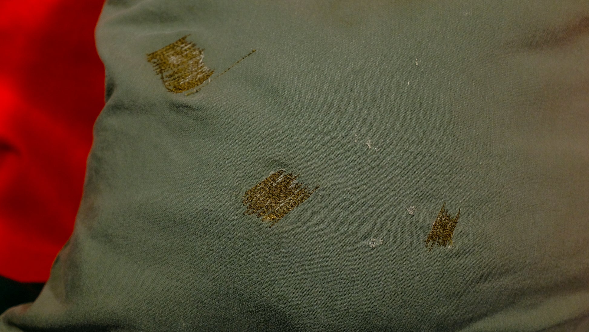 Each bag is used, unique, and adorned with a silkscreen ALL STONES logo, chain stitched embroidery, and a vintage ‘hippie Santa’ sewn-on patch.